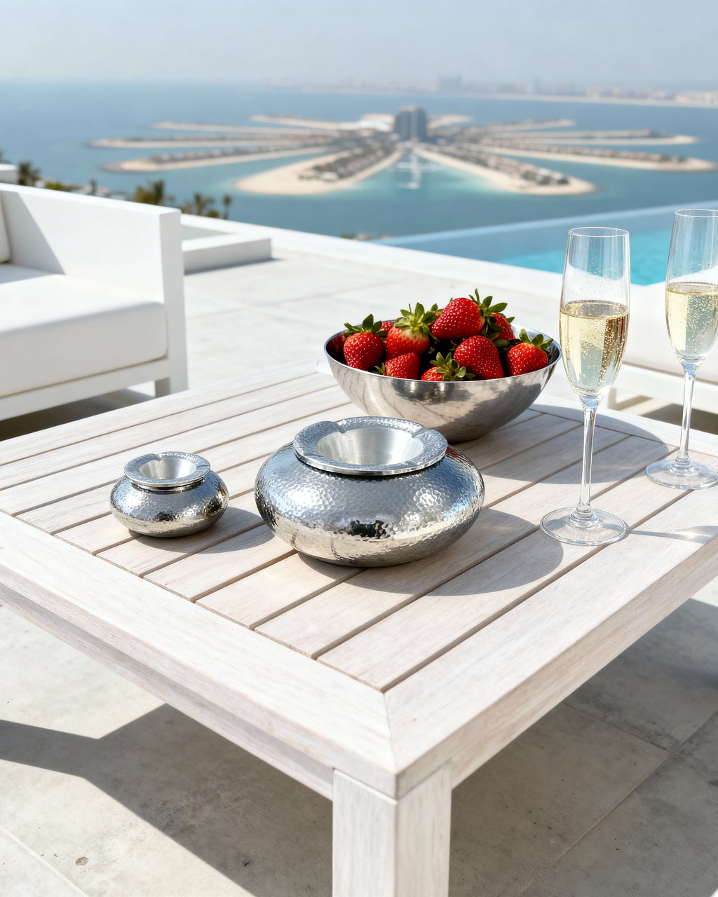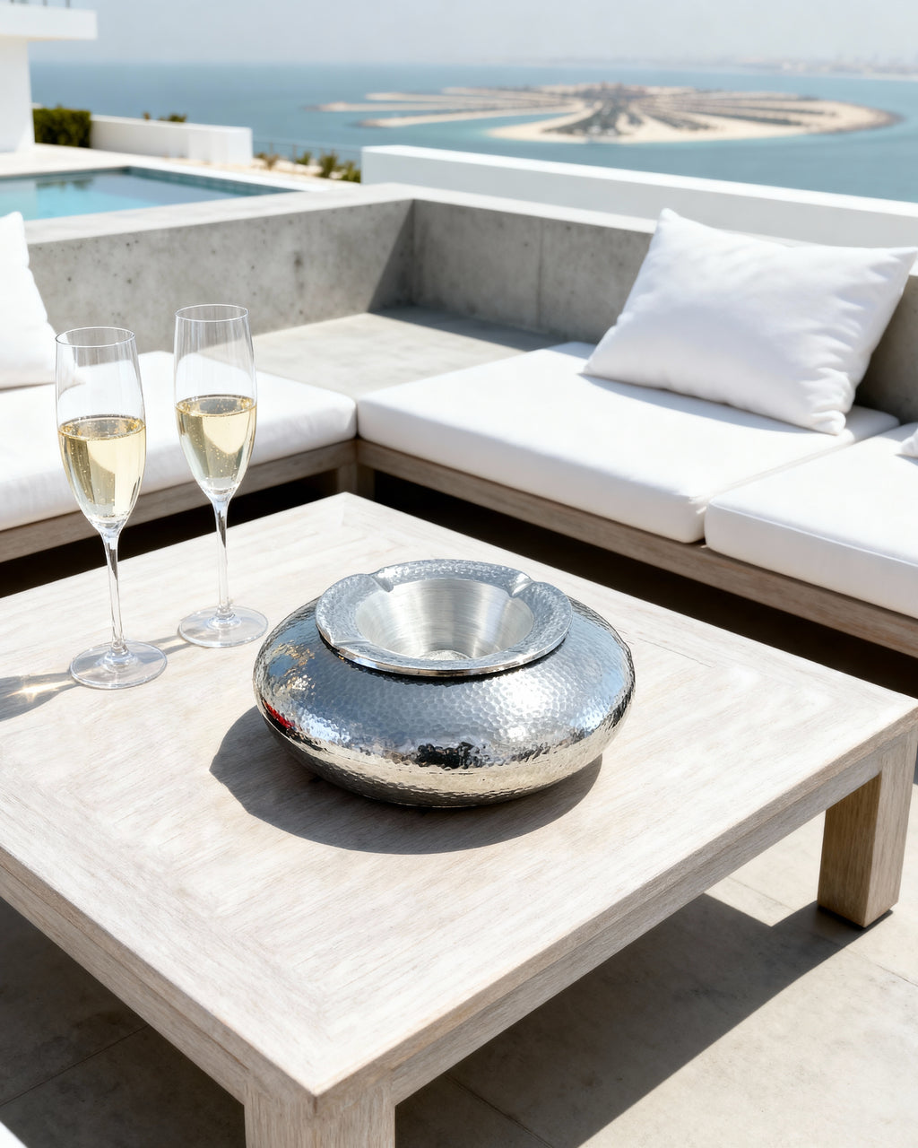 Add a touch of style and functionality to your space with our hand-forged, hammered aluminum wind-proof ashtray. Available in two sizes—Small (12 cm Ø) and Large (24 cm Ø)—this ashtray is perfect for indoor and outdoor use.