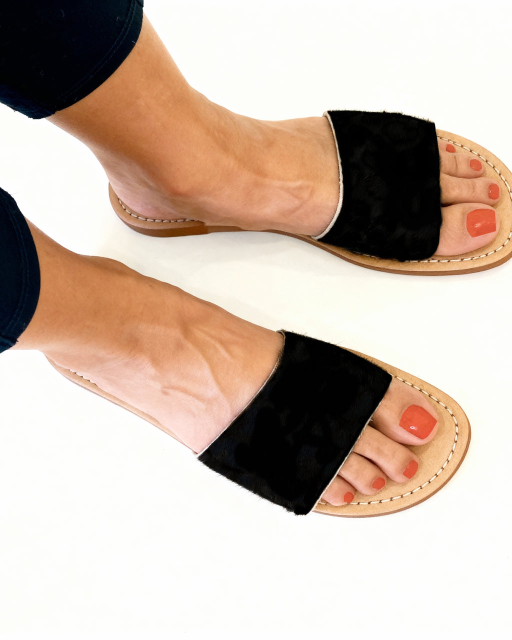 Unsere schwarze Sandale in Felloptik ist ein echtes Statement-Piece: