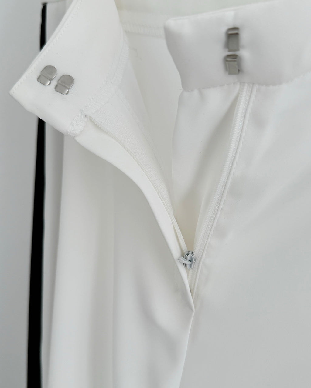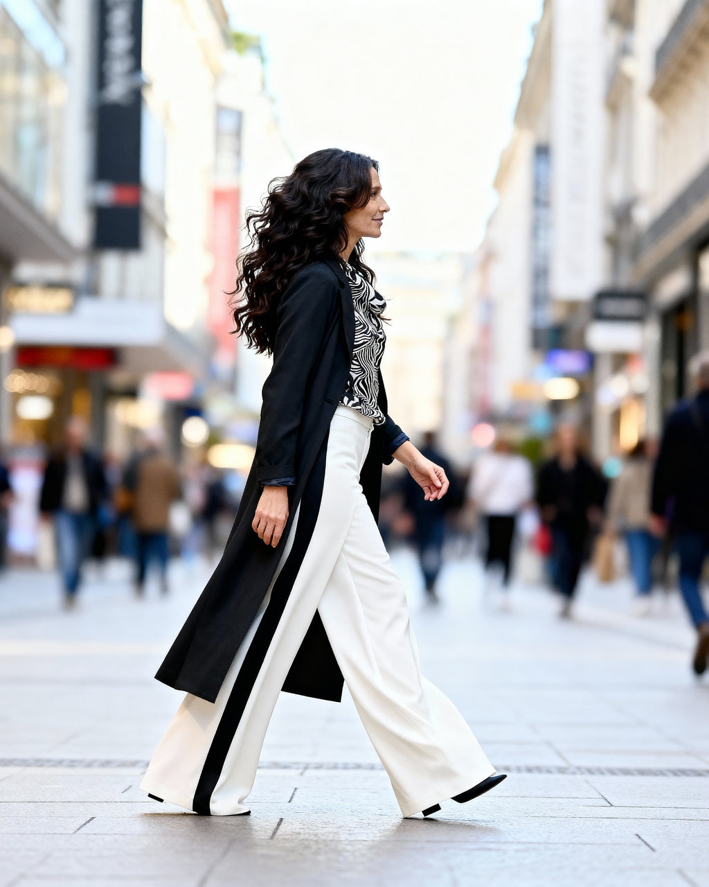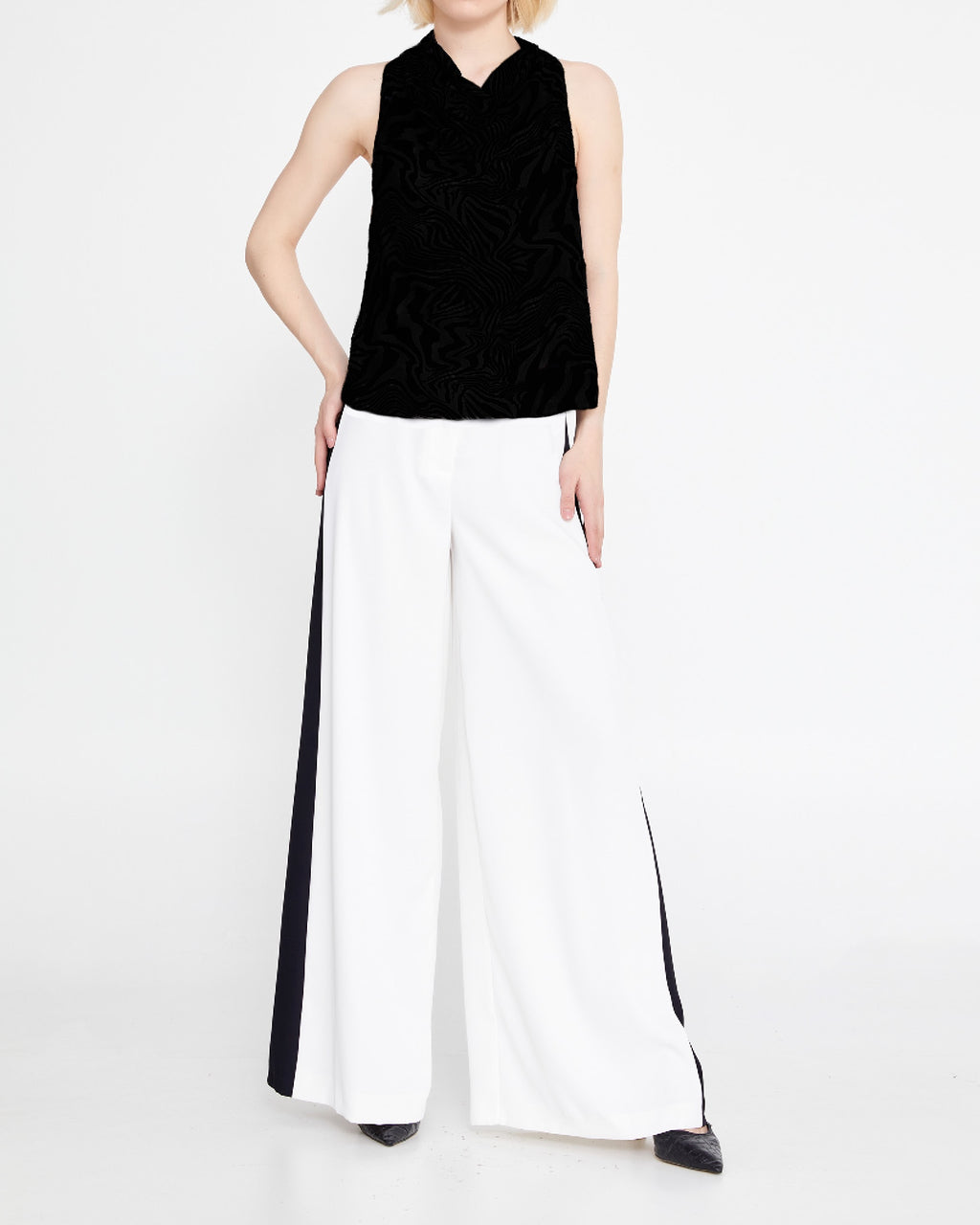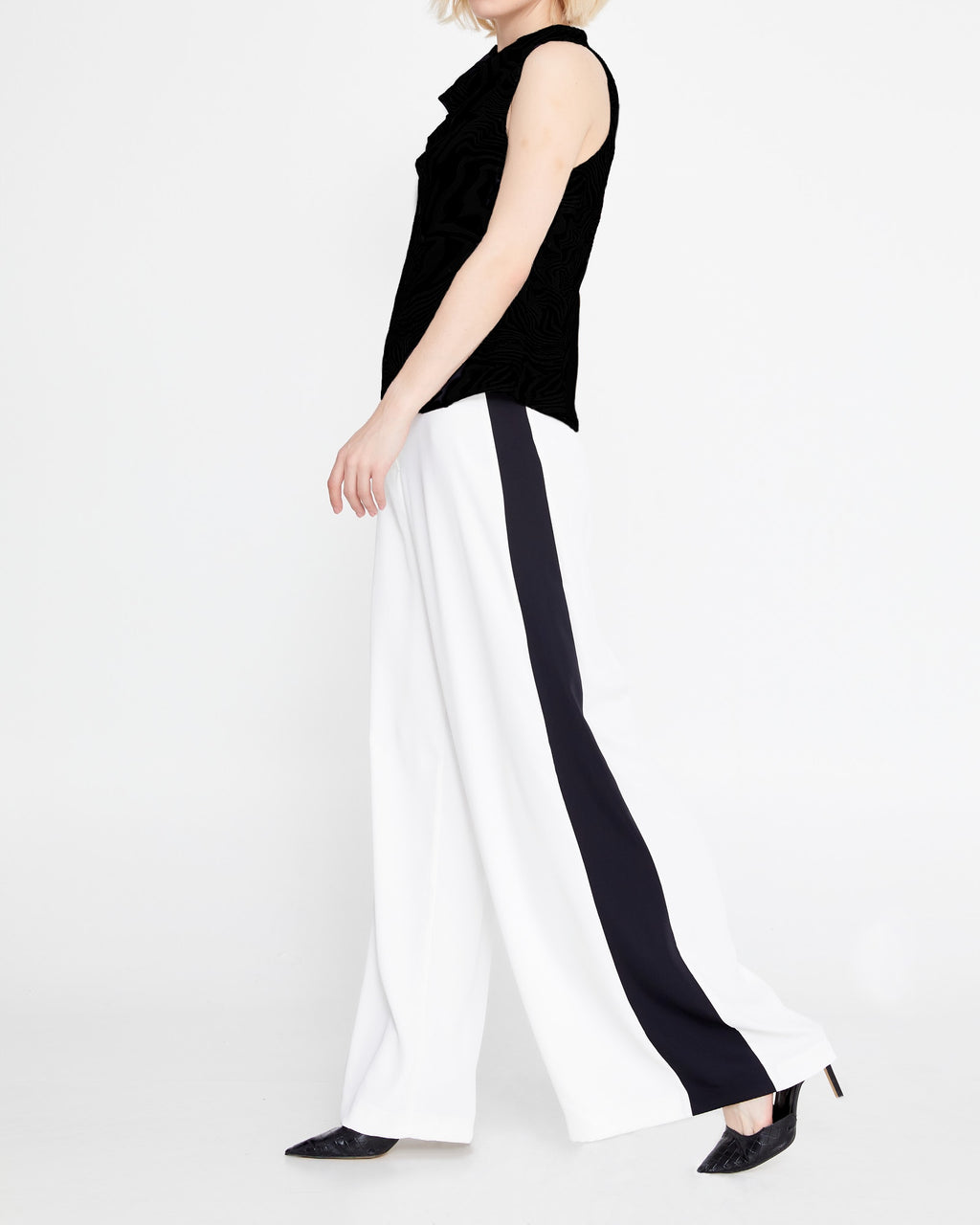 Inspired by Marlene Dietrich’s timeless style, these high-waisted trousers feature a tailored wide-leg cut for an effortlessly elegant look. A sleek black stripe adds a contemporary, sporty twist, making them versatile for both refined and casual outfits.