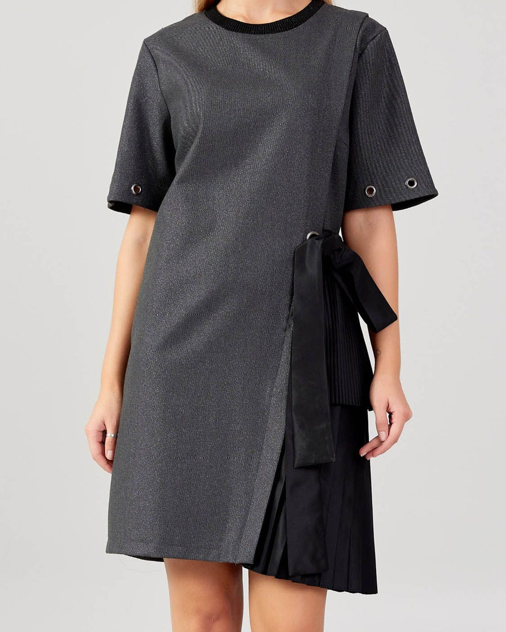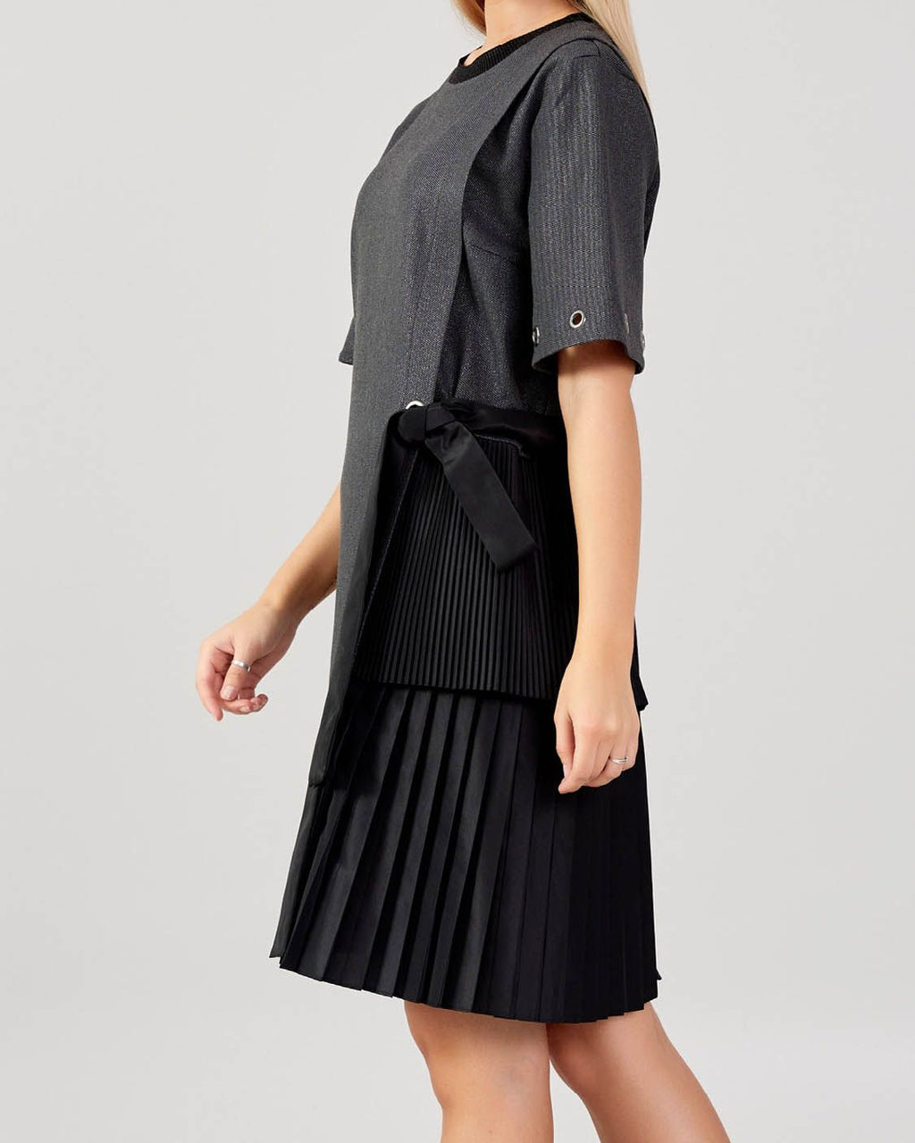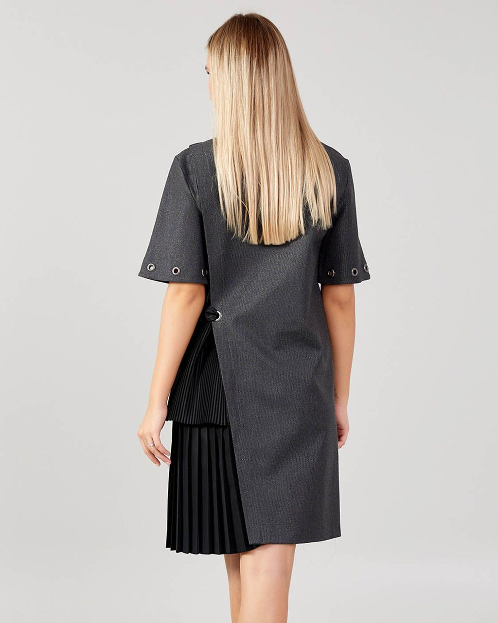 Αυτό το μίντι γκρι-μαύρο πλισέ φόρεμα διαθέτει ένα ξεχωριστό ασύμμετρο σχέδιο, καθιστώντας το ιδανική επιλογή για κάθε περίσταση. Η στρογγυλή λαιμόκοψη και τα ¾ μανίκια είναι διακοσμημένα με τρύπες και στις δύο πλευρές. Δύο κορδόνια στην αριστερή πλευρά μπορούν να δεθούν για να δημιουργήσουν έναν φιόγκο που αναδεικνύει τις πτυχωτές λεπτομέρειες της φούστας. Σύνθεση 65% πολυεστέρας, 30% βισκόζη, 5% ελαστάνη. Φροντίδα: Πλύσιμο στο χέρι σε πρόγραμμα έως 30 βαθμούς και σιδέρωμα στο επίπεδο 1. Βάρος περίπου 450 γρ. Ετικέτα: Say, Παράγεται στην Τουρκία.