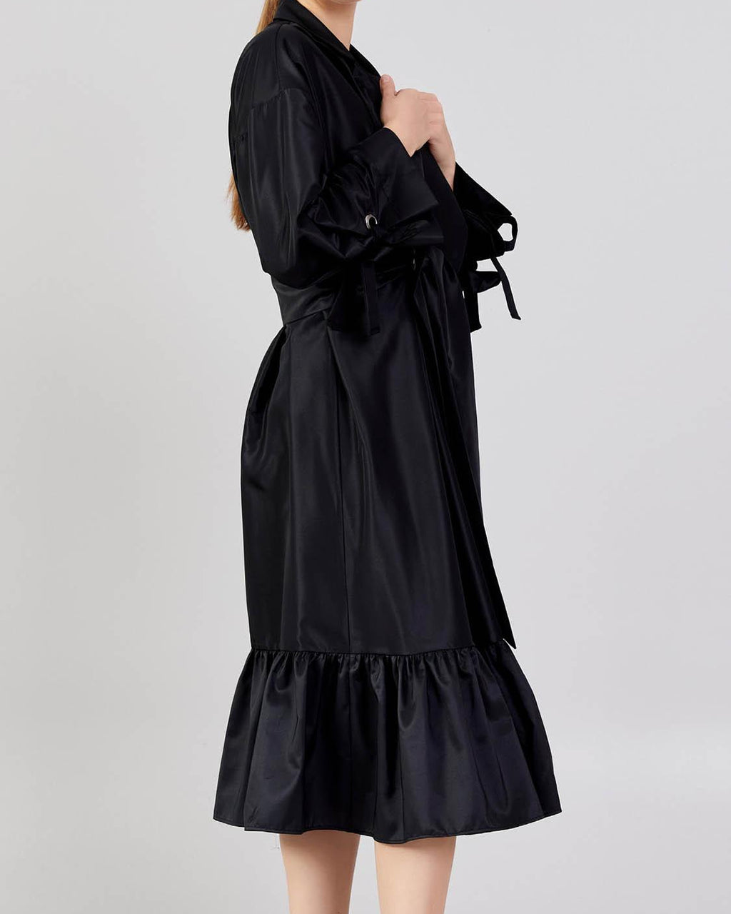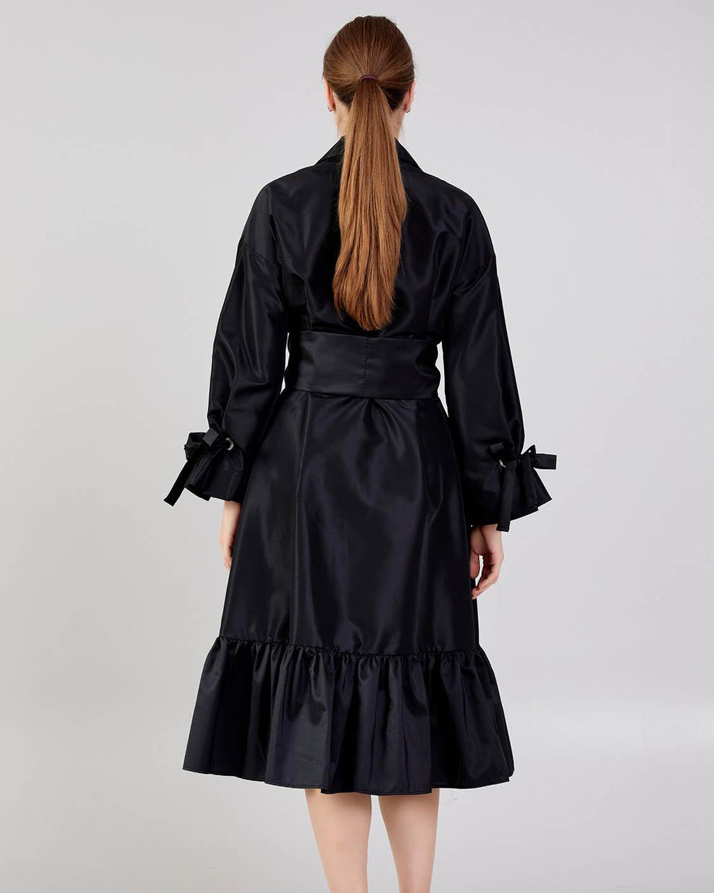 Λεπτομέρειες: Ρυθμιζόμενη ζώνη (δένει μπροστά ή πίσω), ρυθμιζόμενο μήκος μανικιών με φιόγκους, φαρδιά βολάν