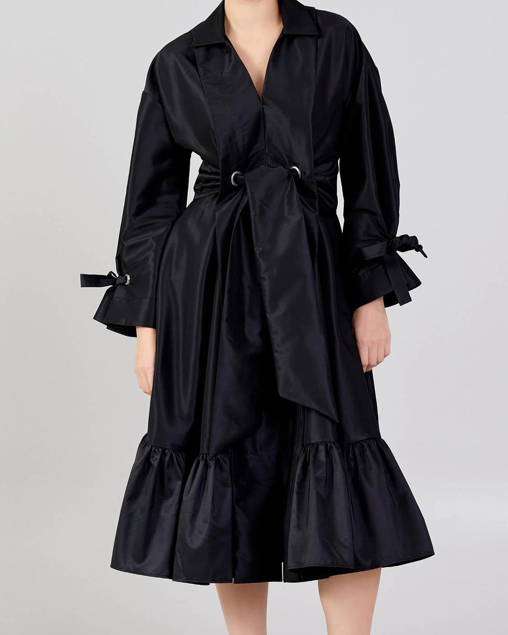 Διαχρονική κομψότητα – Φαρδιές βολάν, V-λαιμόκοψη και εκλεπτυσμένη Α-γραμμή που κολακεύει κάθε σιλουέτα.