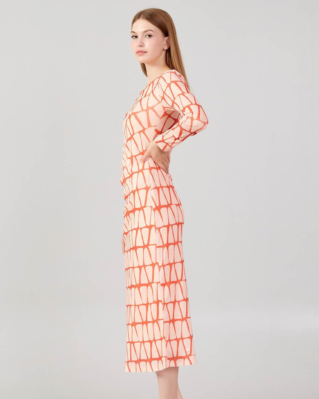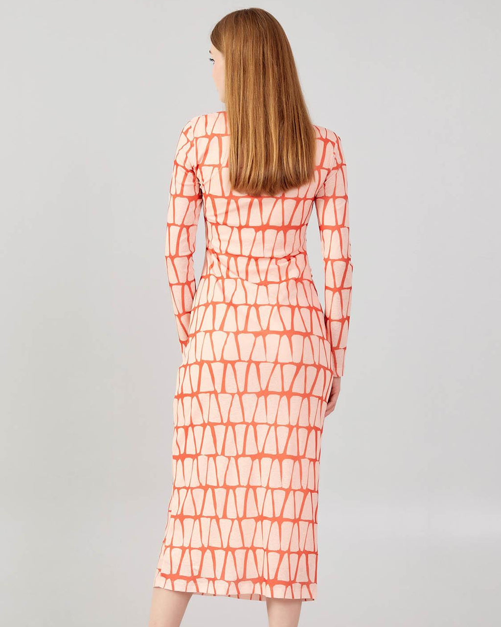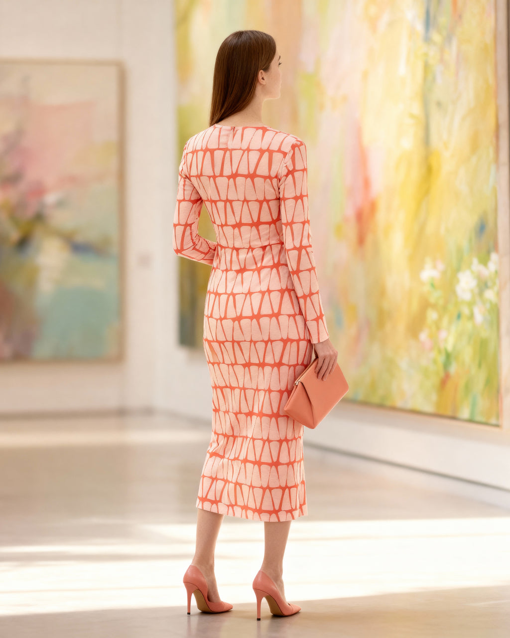 Step into effortless sophistication with this pretty coral geometric midi dress featuring a straight cut silhouette and slightly gathered detailing for a touch of feminine elegance. The long sleeves and art-inspired geometric pattern make it a timeless piece that flatters your figure while adding a modern, confident edge.