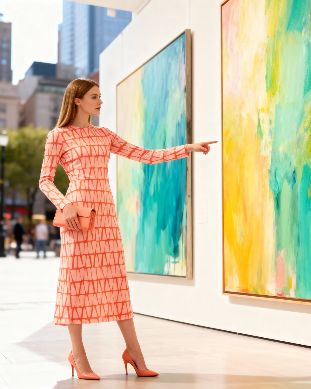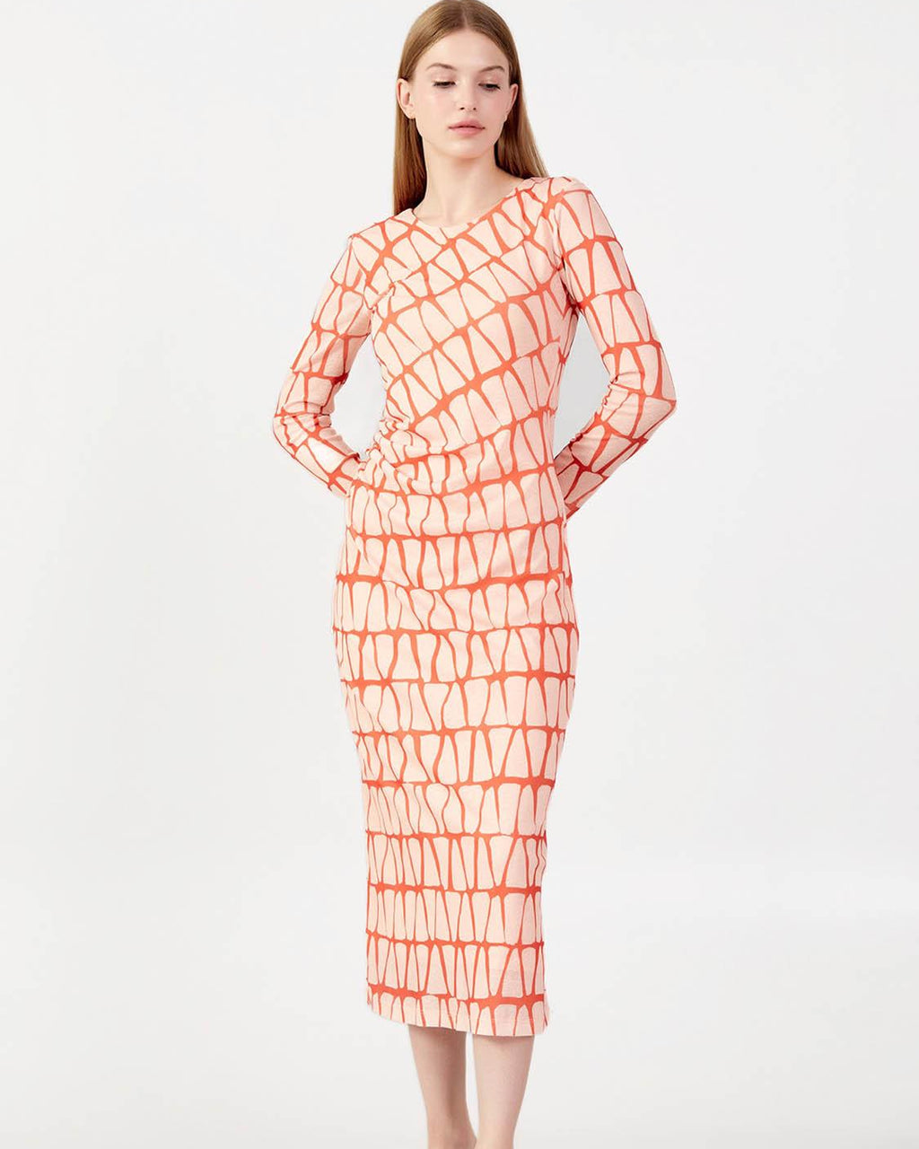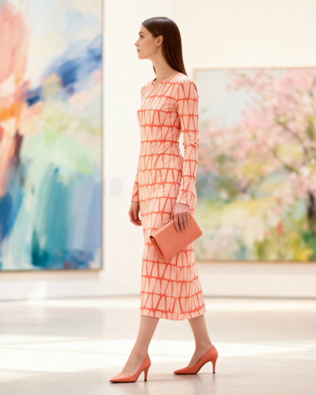 Step into effortless sophistication with this pretty coral geometric midi dress featuring a straight cut silhouette and slightly gathered detailing for a touch of feminine elegance. The long sleeves and art-inspired geometric pattern make it a timeless piece that flatters your figure while adding a modern, confident edge.