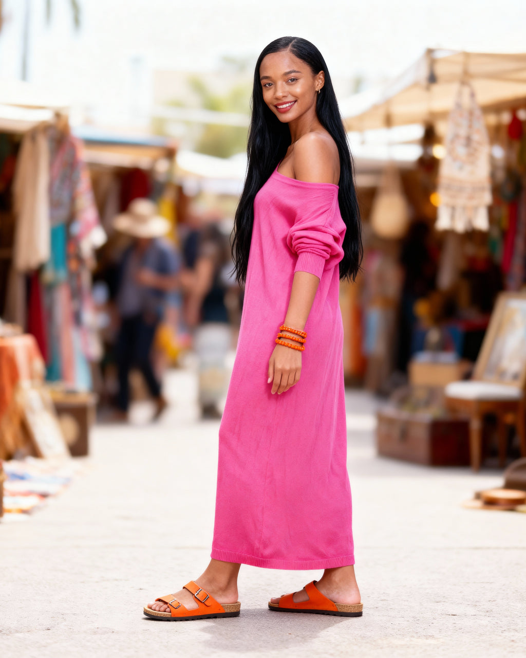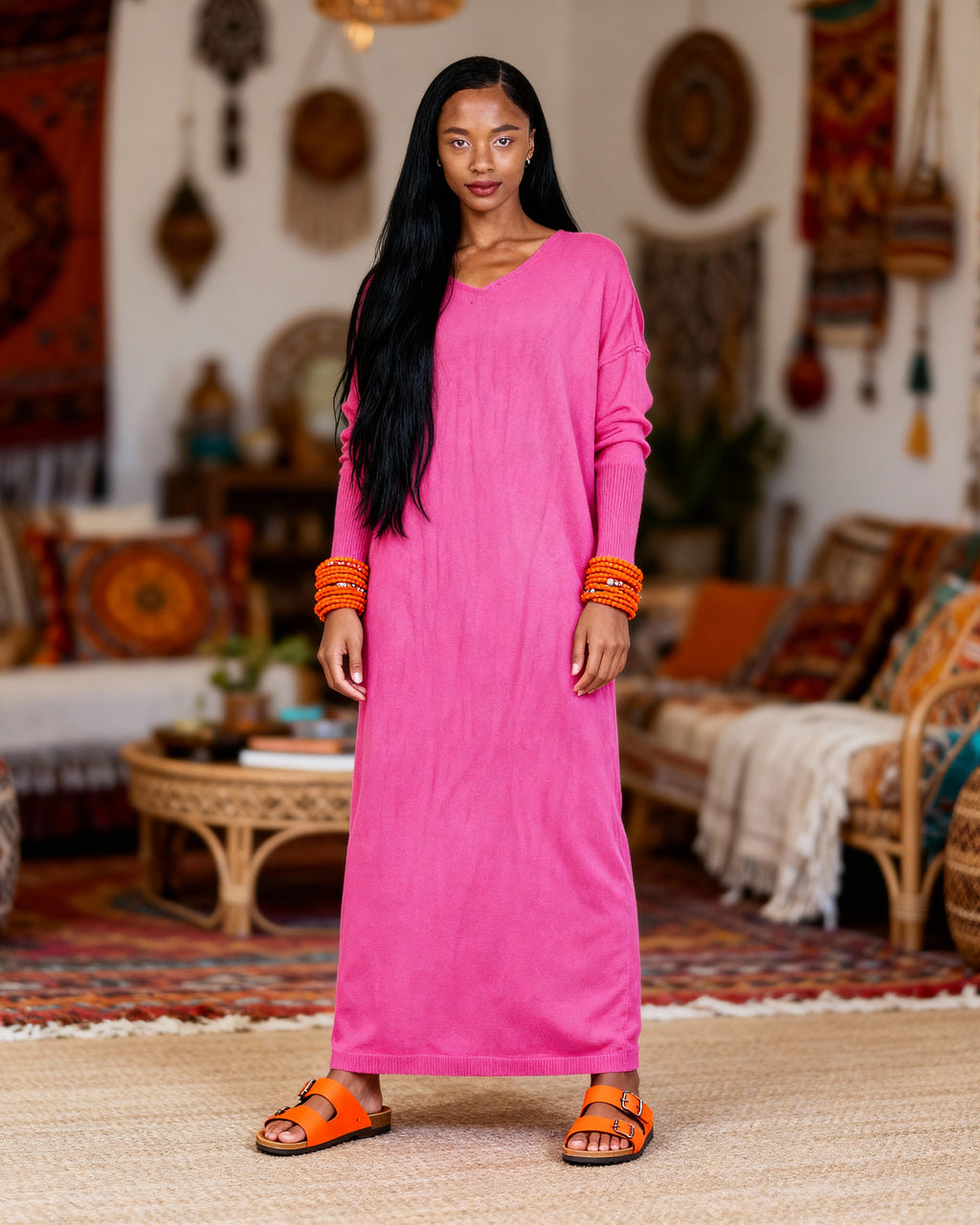 Michela Mii Soft Knit Maxi Dress. Minimalist straight-line silhouette, delicate V-neckline, and ultra-soft fabric blend, this long sleeve dress offers the perfect balance of elegance, comfort, and modern style. Its full-length design provides flattering coverage, making it ideal for chic daytime outings, travel, or evening wear in Sitia, Crete and beyond.