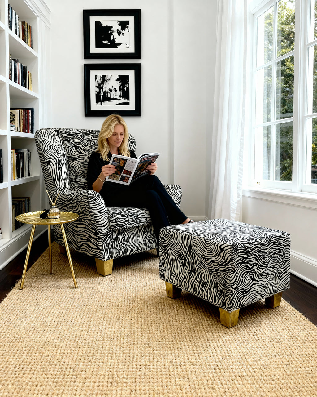 Complete your interior styling with the SITIA zebra-pattern stool covered in cowhide leather. Crafted by artisans in Morocco, this striking piece combines traditional workmanship with modern luxury — a perfect companion to the matching zebra armchair or as a standalone décor highlight.
